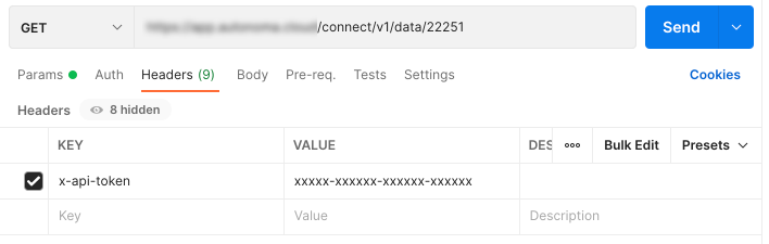 For example, when using Postman, define the x-api-token header with your token value to authenticate your requests.